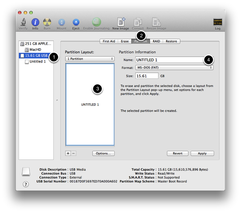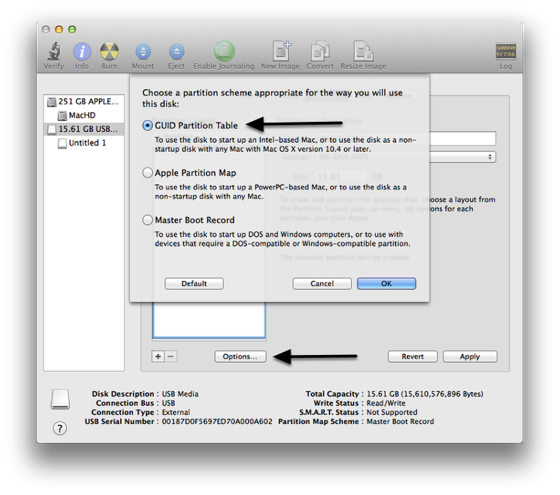 Select the external drive in the left side column. At the bottom of the Disk Utility window will be information about the disk. If the Partition Map Scheme is already set as “GUID Partition Table” you may skip to the section below “Create the Destination Partition”. If the Partition Map Scheme is anything other than “GUID Partition Table”, proceed to the section “Erase Disk”.