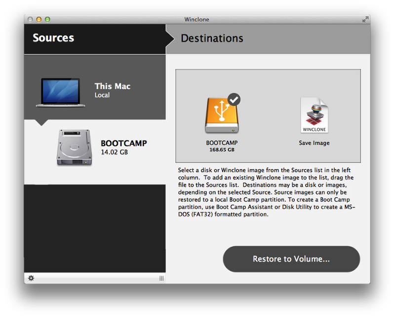 Once the partition has been created in Disk Utility, you may quit out of Disk Utility. Verify that the newly created partition is visible as a mounted volume on the Mac desktop. Open Winclone and select the current internal drive's Boot Camp partition in the Sources column. Or, if you have a Winclone image that will be used as the source for the migration, chose the Winclone image file in the Sources column. Select the new external drive MS-DOS (FAT32) volume as the Destination. Click the "Restore to Volume" button to begin the migration process.
