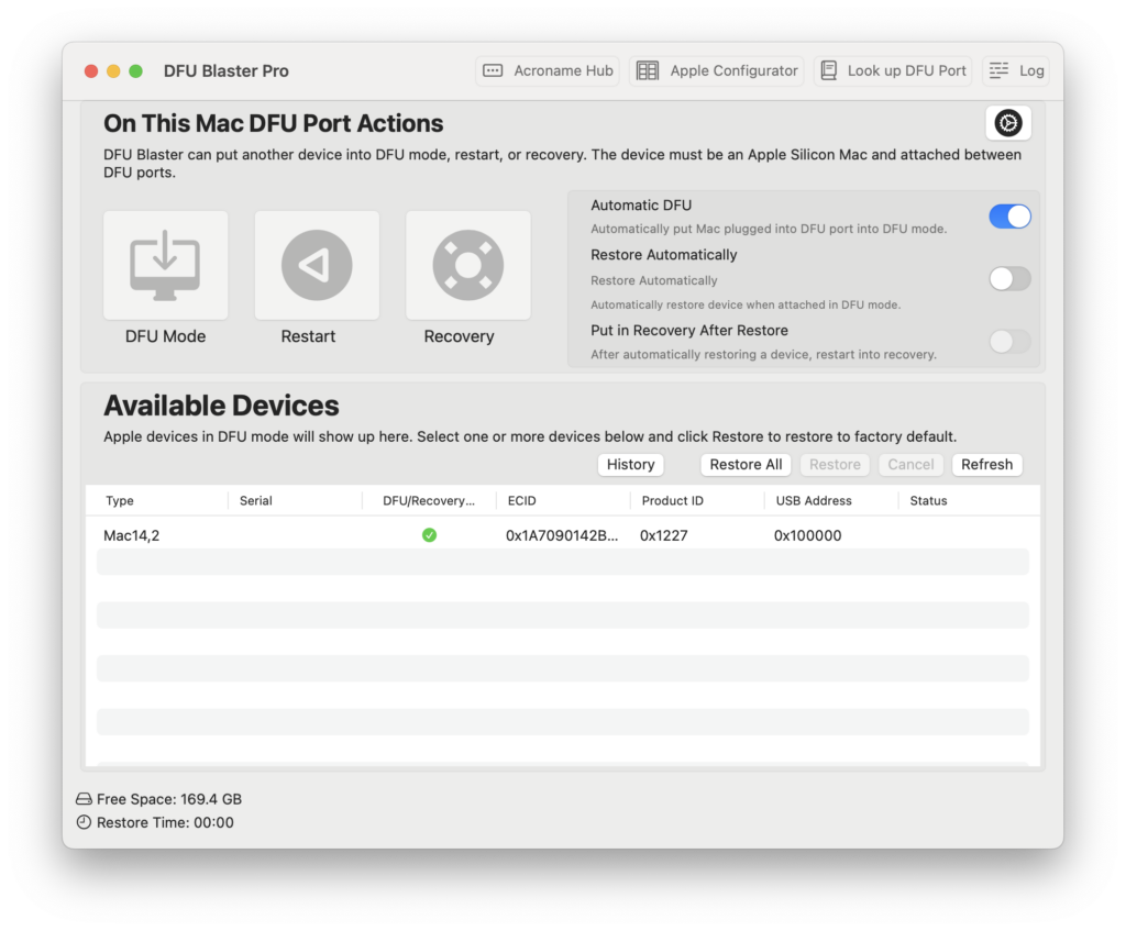 Multiple Mac systems in DFU mode can be restored simultaneously using DFU Blaster Pro Restore, Apple Configurator, and a USB hub typically used to attach multiple Mac systems to a Mac. DFU Blaster Pro can send a command to an Apple Silicon Mac system plugged into an Acroname USBHub3c to put the Mac into DFU mode, and the Mac System will be ready to restore. Before attaching the Macs to a 3rd party hub, they must be put into DFU mode first. DFU Blaster Pro can be used with Automatic DFU to put the Mac systems into DFU mode quickly and easily. Individually cancel an amchine or, if a restore has failed, restart restoring without interrupting the other Macs.
