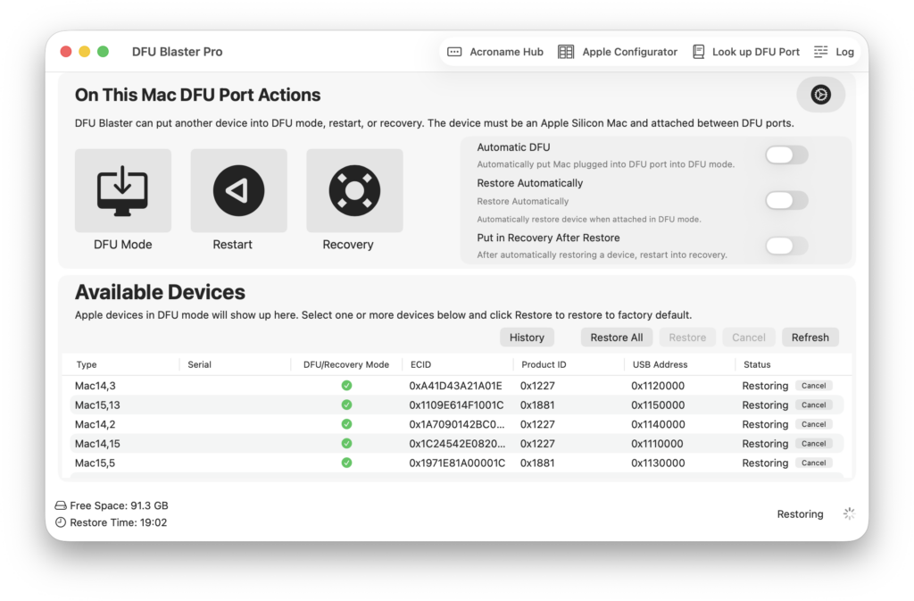 Automatically put a device(s) into the DFU or Restore Automatically to seamlessly restore Macs.