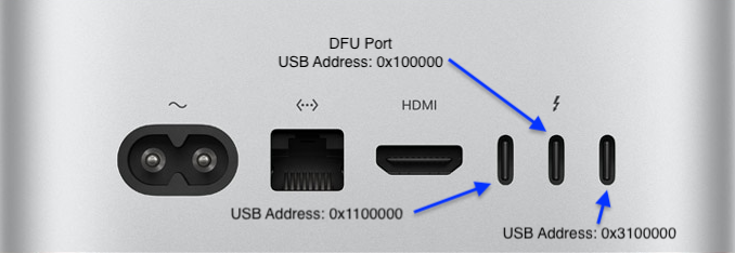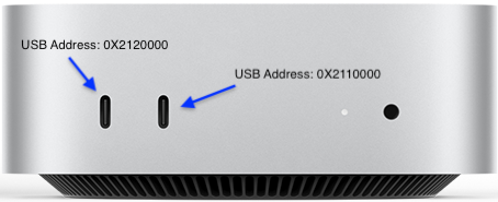 The back of the Mac mini has three USB-C ports. For the device plugged into the port closest to the HDMI port, the USB address is 0x1100000, the port middle device is 0x100000, and for the device plugged into the farthest to the right port, the USB address is 0X3100000. The middle port on the back is the only port that will put Apple Silicon Macs into DFU mode. All three ports on the back of the Mac mini have separate USB 3.1 buses and can be used to restore machines in DFU mode in about 8 minutes.